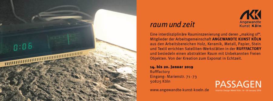 Im Rahmen der Gruppenausstellung „raum und zeit“ werde ich erstmals in Zusammenarbeit mit der AKK meine Arbeiten inszenieren und präsentieren. Die Ausstellung ist Teil der PASSAGEN 2019 und findet vom 14. bis 20. Januar in der Rufffactory